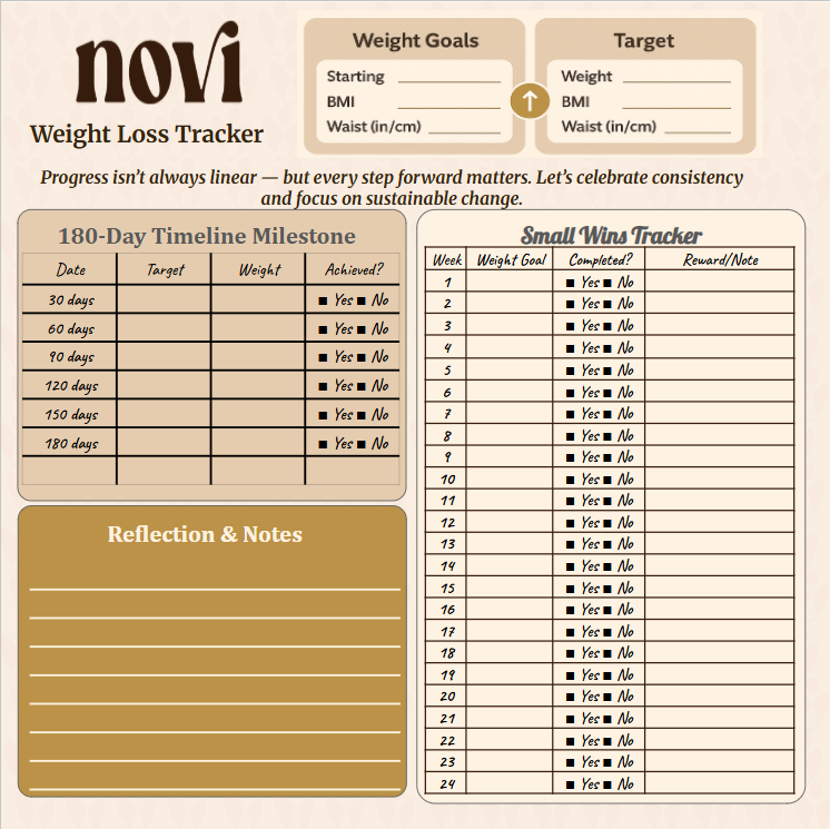Write It Down: Track your starting weight, target, and timeline. You can also submit your goals through Novi’s online form for personalized feedback.